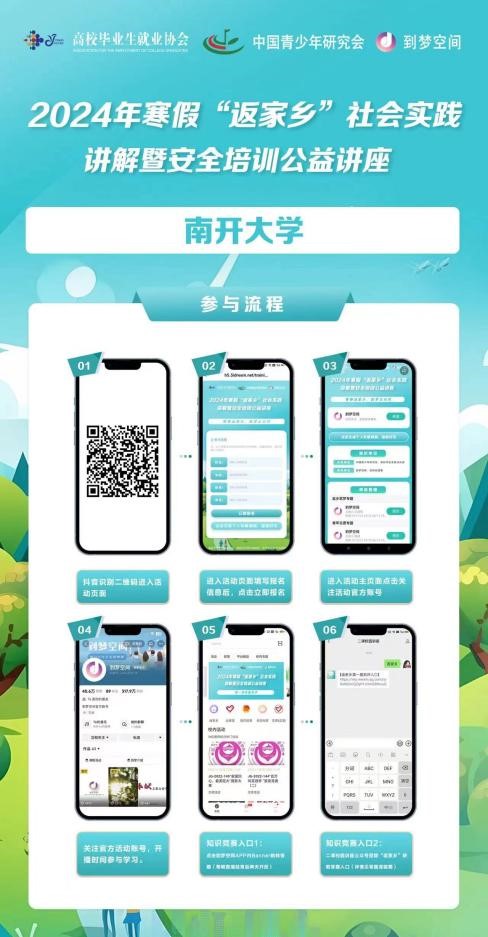 为深入学习宣传贯彻党的二十大精神,贯彻落实习近平总书记关于青年工作的重要思想,切实做好“返家乡”“三下乡”社会实践工作,大力培育和践行社会主义核心价值观,加强优秀传统文化教育,弘扬和培育民族精神。学校联合中国青少年研究会和高校毕业生就业协会、到梦空间共同开展第二课堂系列公益讲座——2024年寒假社会实践安全培训讲座。现将具体事宜通知如下: