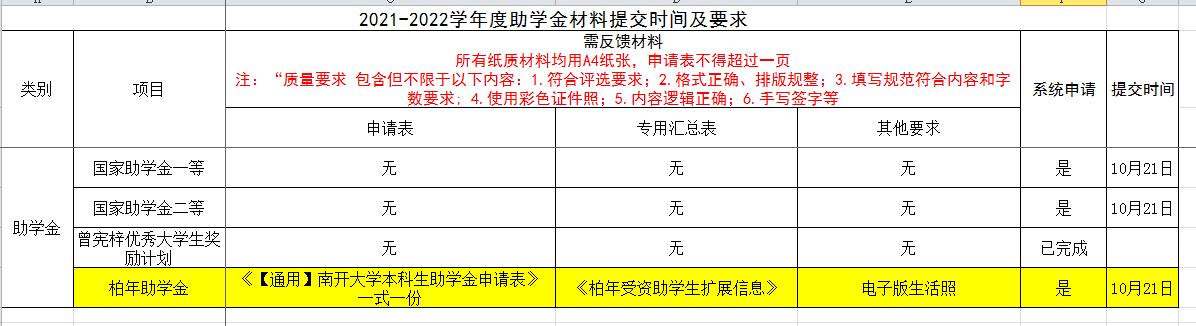 2.其他材料:具体要求参照下图,其中所有需提交的申请表、感谢信均只需纸质版,专用汇总表、照片(以姓名-助学金名称命名)只需电子版。